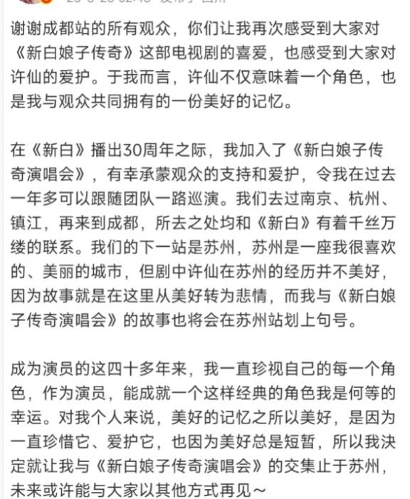 赵雅芝在对待《新白》这个 IP 上,跟叶童是完全不同的两种模式,在演唱会收官之后,才正式离场。
